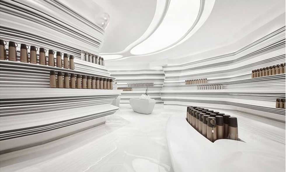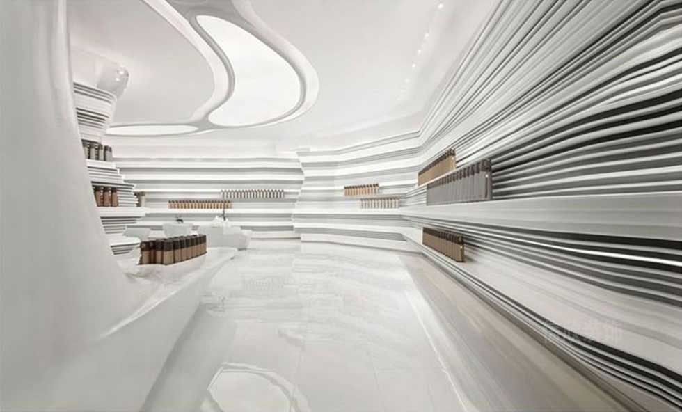 通過不規(guī)則的頂面,和墻頂一體式半圓弧的分隔方式,展示區(qū)和展臺兩種不同的概念,延伸性非常好,通過現(xiàn)代科技虛實(shí)結(jié)合的設(shè)計理念,營造出的多元化的精品展示完美效果。