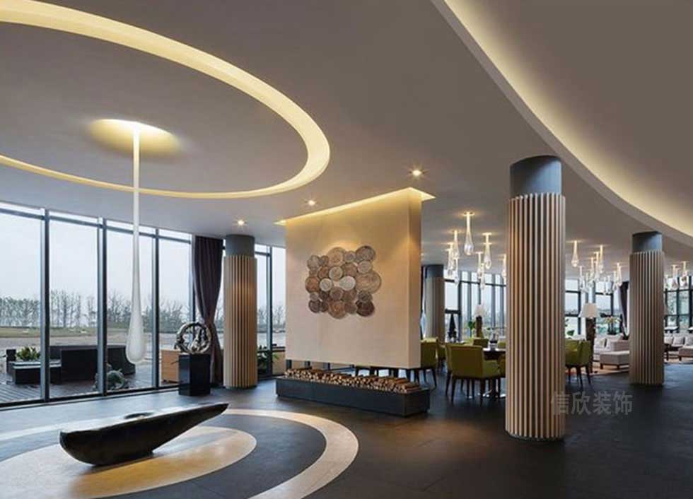 百葉折紙式樣的柱子,活躍性和美觀性兼而有之,普通的白色頂面,在不規(guī)則排列的水滴般的造型吊燈裝飾下,如鐘乳,如冷棱般垂直自然,在光影的照射下,美觀而溫馨迷人。