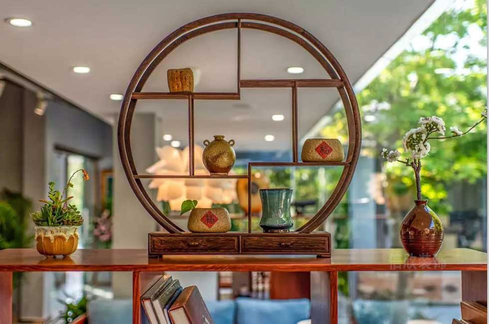 轉角處作為會客區,和玻璃的隔間做了一個承接,開放式的空間,寬敞而不顯得壓抑,實木仿古的置物架和吊燈,既是洽談和休閑功能區,也是一種中式風情的的室內展示景觀。