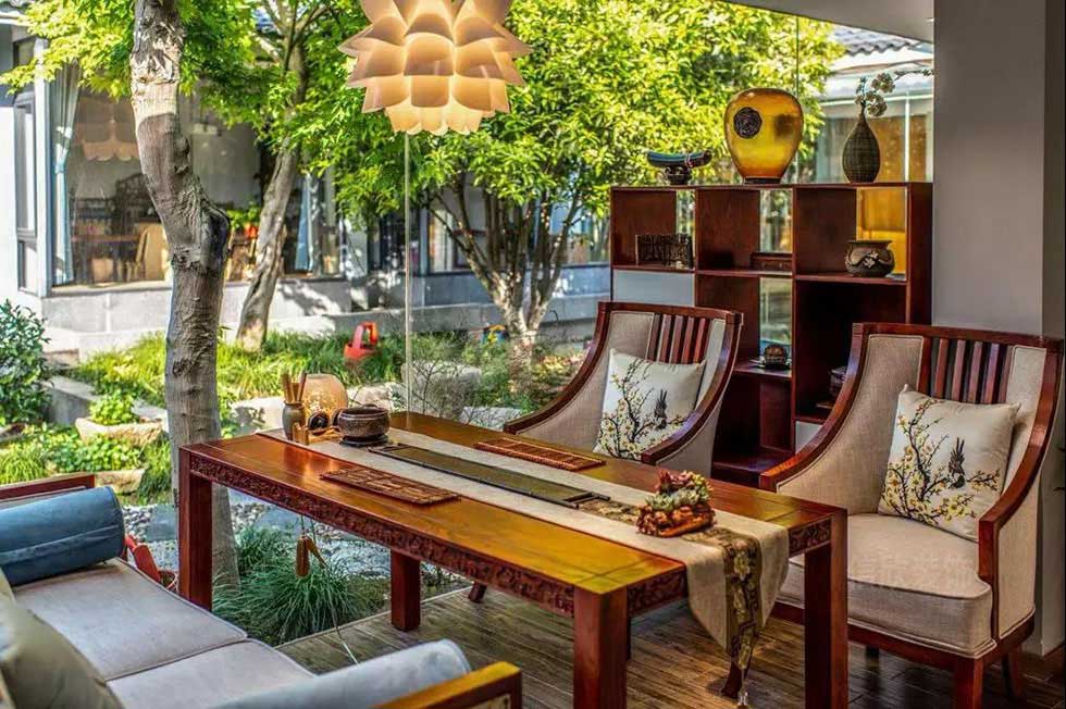 灰色的水泥地磚,白色的墻和頂簡單處理,更有歲月侵蝕的恒基,配上實木的長桌和竹椅,望著窗外通透明亮的庭院,把實木裝飾的韻味發揮的淋漓盡致。