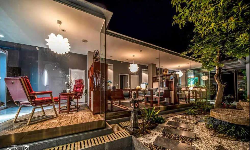 開放式的玻璃房間,取代傳統的隔墻,夜間在光影的照耀下,又有另一番區別于白天的景致,中式的庭院在夜色的籠罩下,古色古香的味道似乎在述說著遙遠的故事。