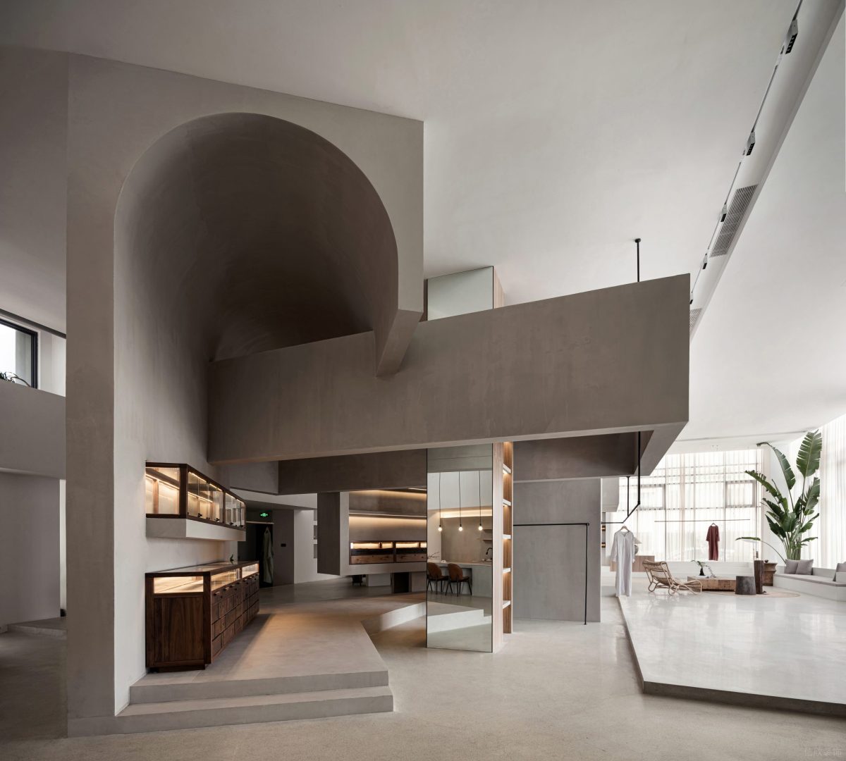 辦公室設計從黑色的入口看去與室內大面積白色形成強烈對比。