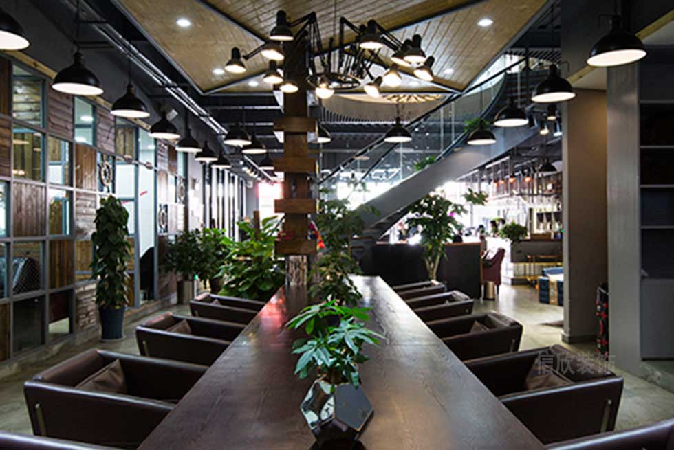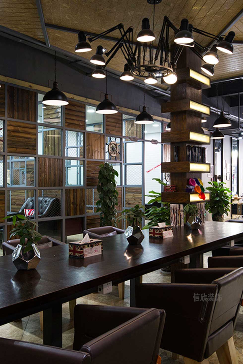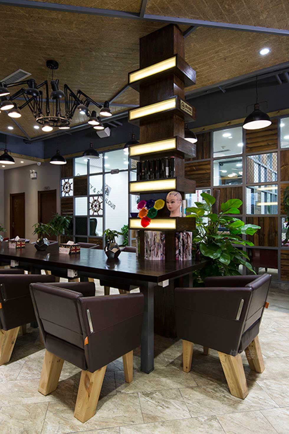 原始結構的鐵藝頂面和實木頂面的結合,粗獷中帶著一份工業的氣息,實木包邊柱子改造的置物架,搭配黃色的燈膜,既可以作為展示的置物架,宣傳企業文化和時尚理念,也是一個獨特的景觀。長條形的復古長桌,滿足多重使用功能,平時的接待洽談,開會使用,也能提供給客戶做一些美甲的服務。