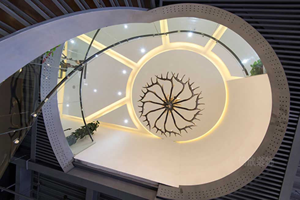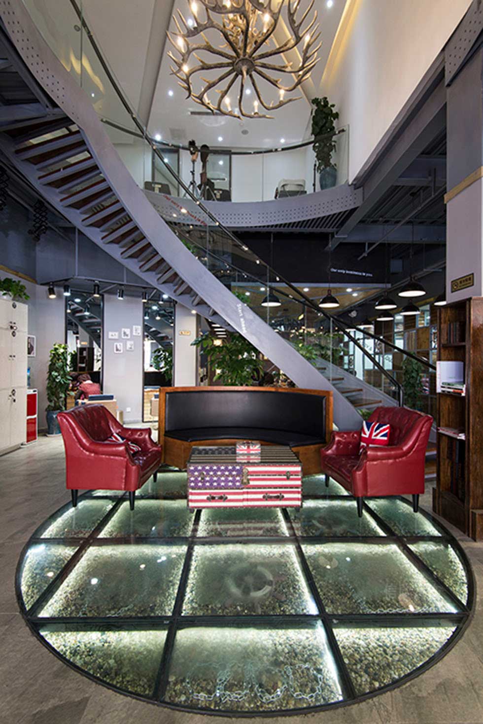 整體的旋轉式鐵藝樓梯展現出工業風的金屬粗獷感,灰色的仿古紋理地磚,增加一些古舊的斑駁,圓形鐵藝架加鏤空式玻璃和射燈的地面景觀設置,新穎時尚,工業和現代結合的設計特性。