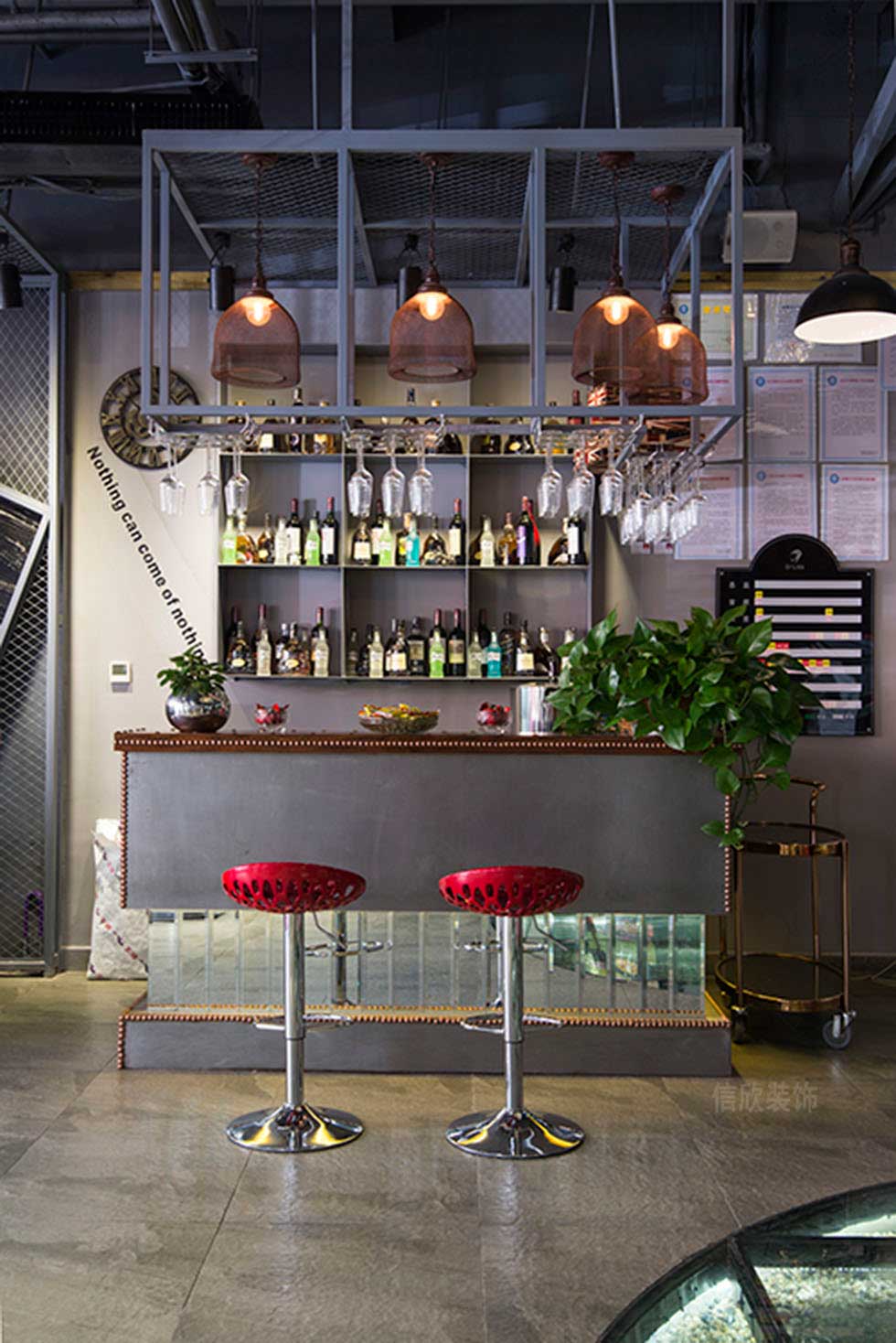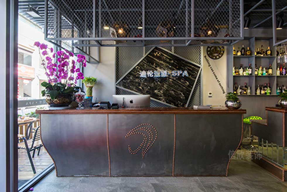 灰色的整體背景,鐵藝的燈罩和背景墻,隨意而充滿個性,深色紅色加鐵釘的前臺,用手工制作的表現形式,打造出皮藝的質感,看上去特點鮮明,時尚摩登,成為吸引網紅打卡的圣地。