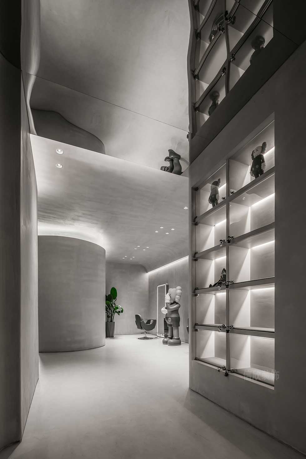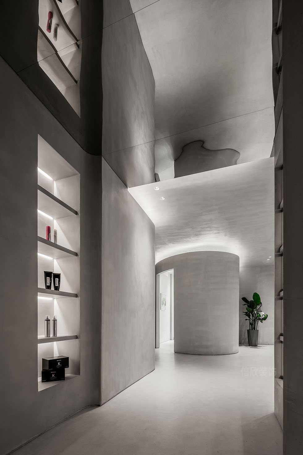 精神性可以被具象或抽象地表達,設計師在有限的空間內(nèi)尋找屬于空間本身的最簡潔有力的語言。區(qū)別于市中心的喧鬧,空間靜靜將人引入脫離平庸的新銳世界,遵循了獨特的質(zhì)感邏輯,隨物賦形,創(chuàng)新與融合空間造型。
