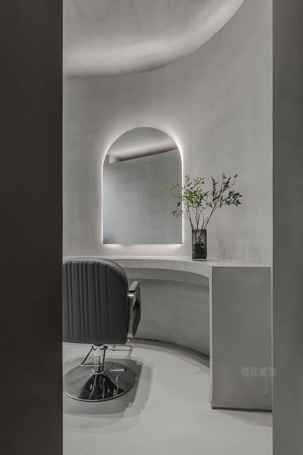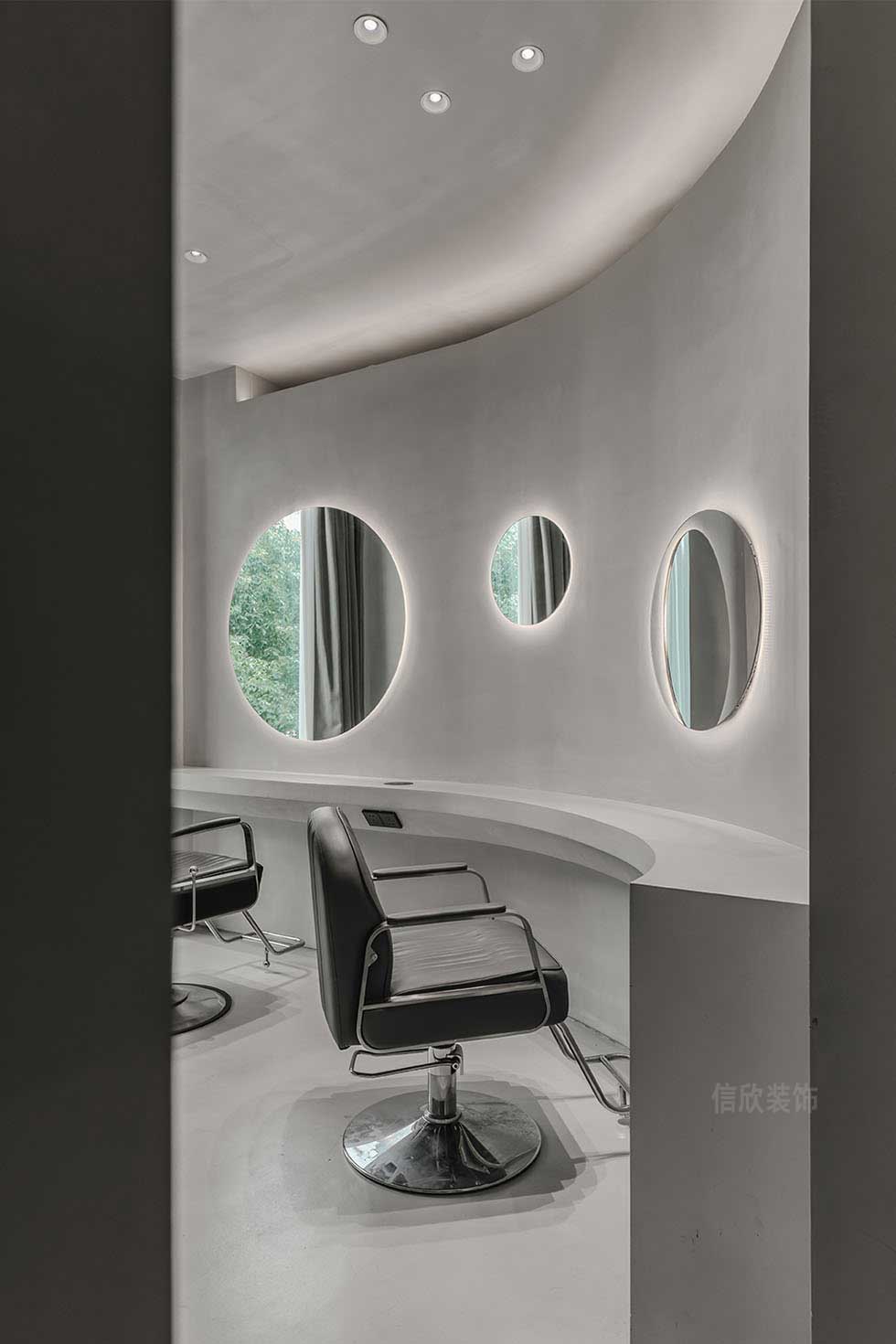 設計再次展現(xiàn)了自然與室內(nèi)的無邊之界,漫長的造型時間難免枯燥無聊,巧妙的設計恰好可以為時光增添生趣。弧線形的操作臺讓每位客人都暢通無阻地欣賞到戶外風景。在等待的間隙給眼睛放個假,也為心靈安排了一段愜意的旅行。