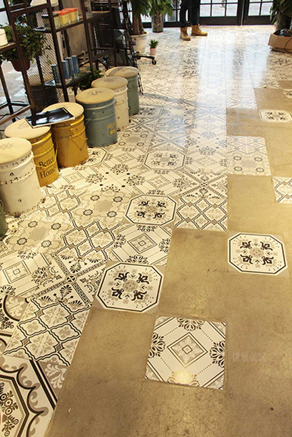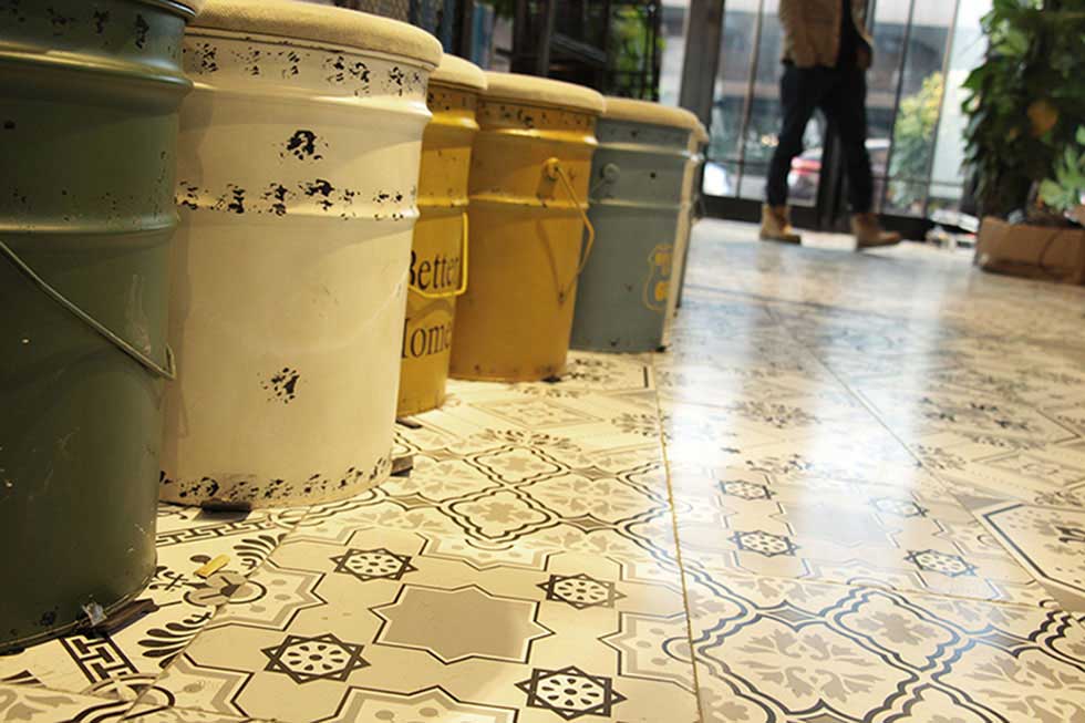 大廳的處理方式,雖然保留了工業(yè)感的管道和水泥的原墻面效果,但總體以開闊通透,光線高飽和度為主,采用拼花式的仿古地磚,追求的是一種原始和復(fù)古風(fēng)的情調(diào)。
