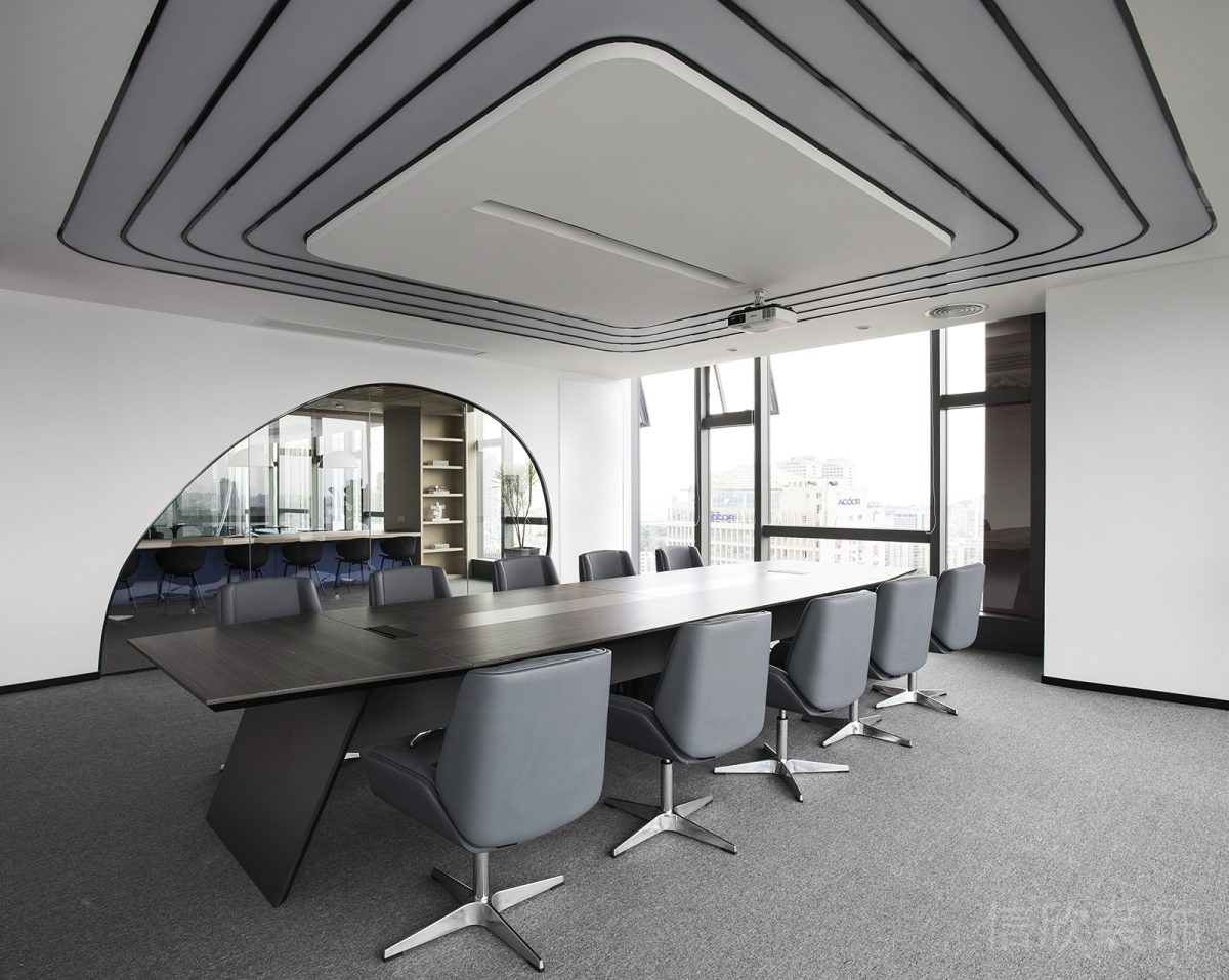 天花裝修設計效果墻柱設計色彩搭配環形白色定制流線型長桌裝修圖深圳辦公室效果圖