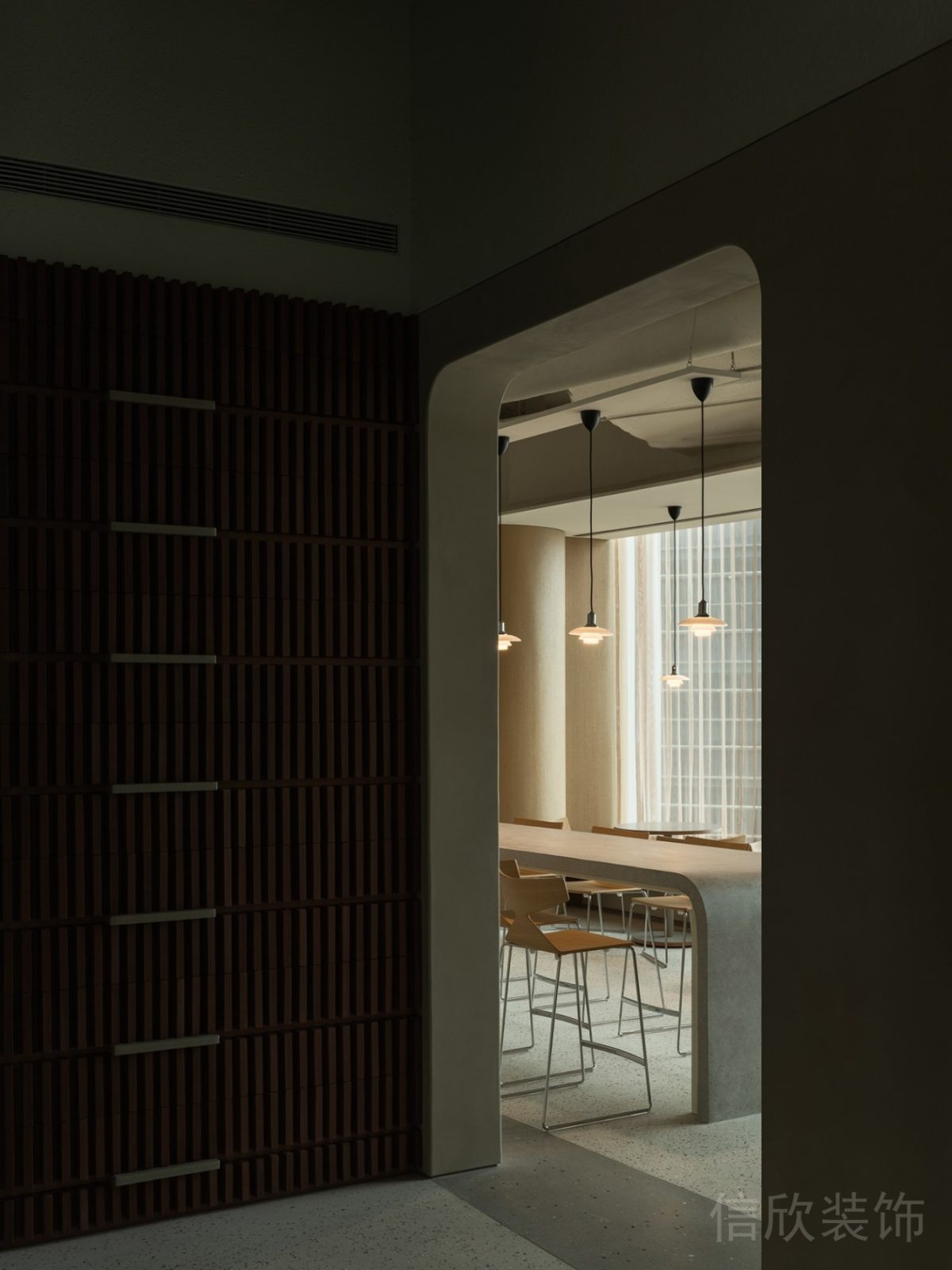 藍色設計效果玻璃隔斷黑色金屬邊框玻璃隔斷灰色調墻體裝修圖圓角弧線設計走廊