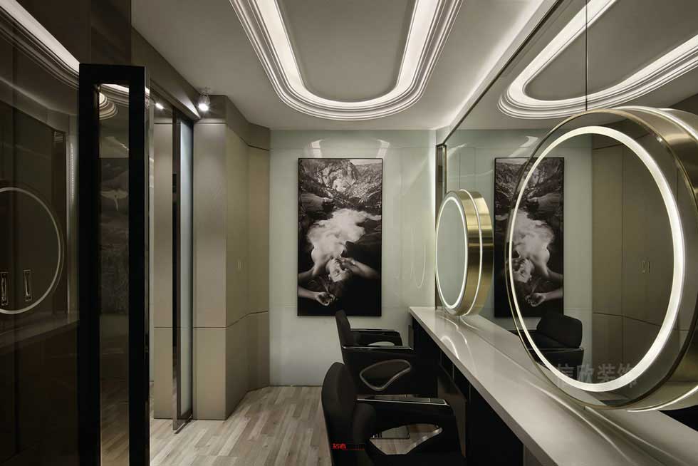 設計師認為,設計作品應該和人產生互動,讓人情感得以滿足,空間與人之間不一樣的互動,造就了不一樣的空間魅力。在燈光的處理上,理發區域的造型燈帶,銅材質的圓環型吊燈兼顧了兩邊座位的燈光需求。和VIP區域的鏡前燈也形成了呼應,強調細節的同時也不失整體的協調。
