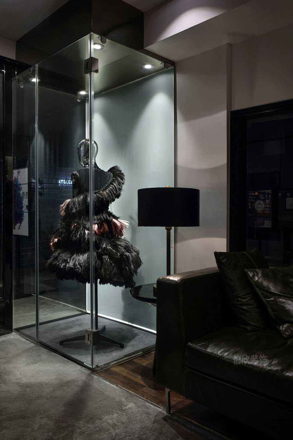 入戶的設計嗎,采用黑鈦拉絲不銹鋼的落地式門窗設計,可以將內部空間最大限度的有一個展示作用,黑色哥特風模特的展示,給場景增加一份神秘和深邃的黑色幽默氣質。