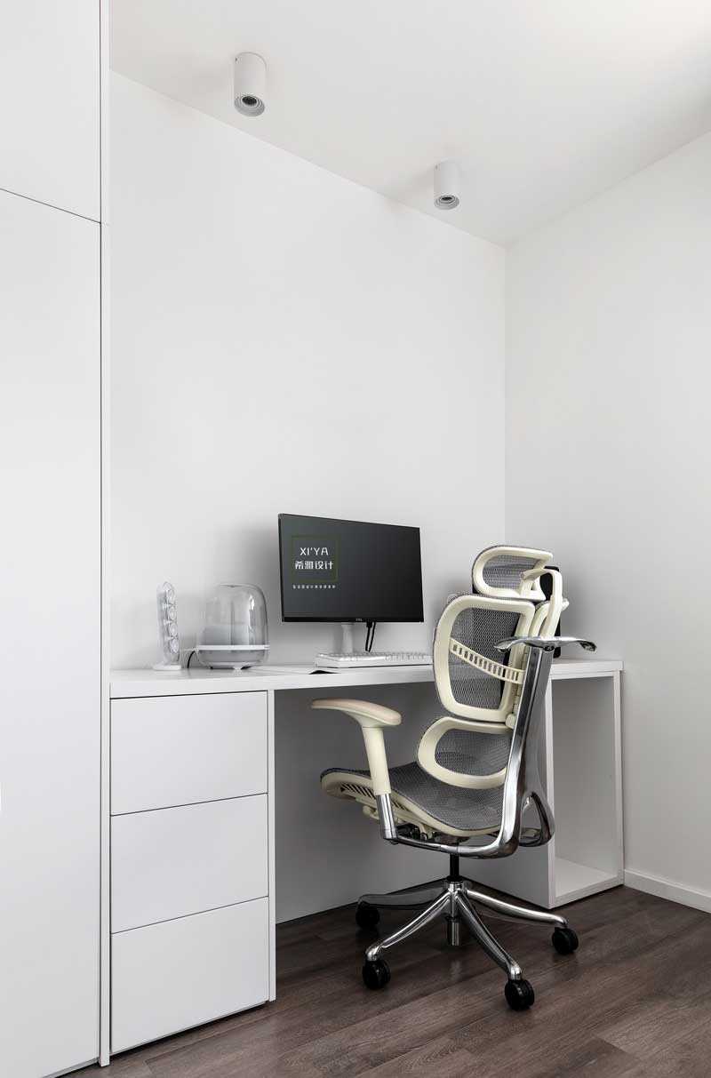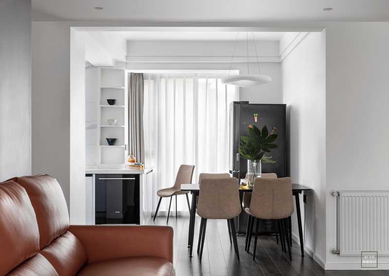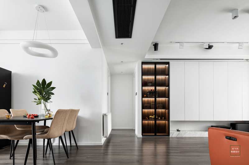 客廳的設(shè)計,以干凈清爽的純白色調(diào)為主體,雙眼皮的吊頂,著重區(qū)分了客廳的空間區(qū)域分隔型,無主燈的設(shè)計,工業(yè)感的軌道射燈,直射式的投影儀,在強(qiáng)調(diào)了功能性的同時,讓整體充滿了現(xiàn)代感和使用的功能性。