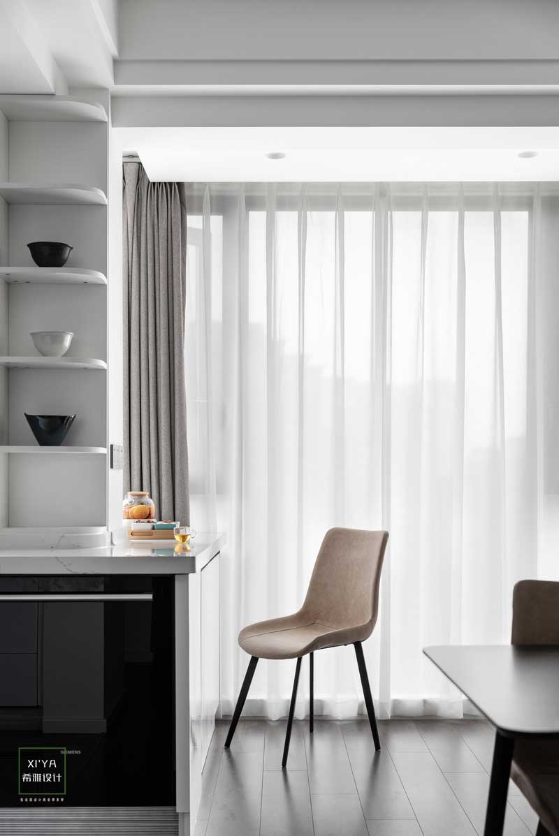 白色的天然大理石紋理墻面,和白色現(xiàn)代隱藏式拉手的柜子,看上去干凈明亮,提升了廚房整體的亮度,黑色大理石的地面,把黑白兩種色彩,經(jīng)典百搭,現(xiàn)代時尚的定義完美的詮釋了出來。