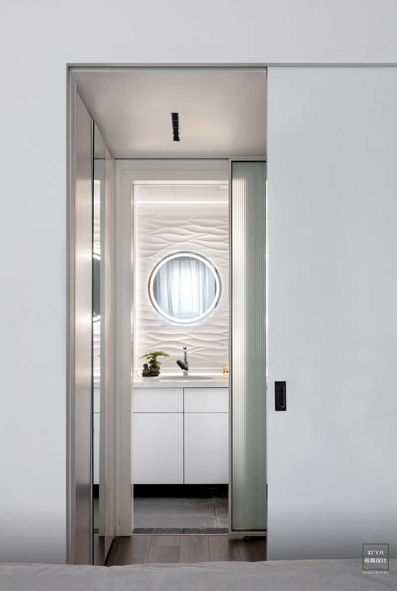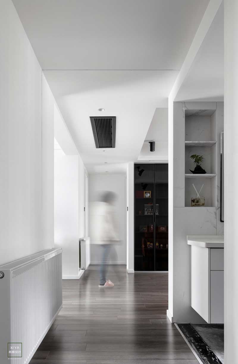 過道的設(shè)計,無頂式無多余裝飾的墻頂,用纖細(xì)的光影燈條,來詮釋一種光影靈動,線條活躍,直擊人心的動心,和立體韻味,賦予了整條過道一種全新的生命力。