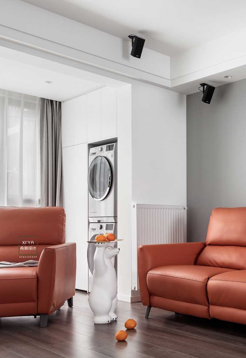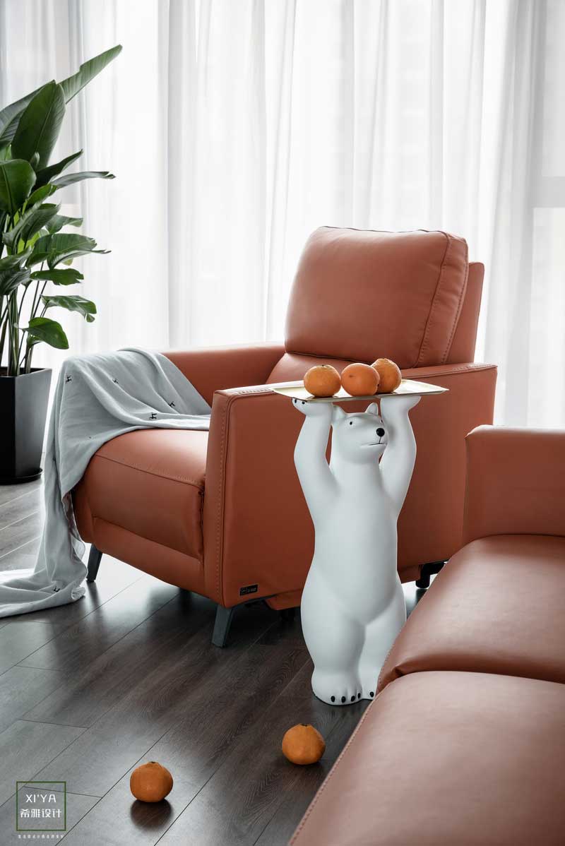 白色的墻面,咖啡色實(shí)木紋理的地面,搭配上皮藝的沙發(fā),給人一種自然原始的現(xiàn)代北歐風(fēng)情,橘紅色的顏色設(shè)計,讓白色的空間,注入了一絲活躍靈動的氣氛感。