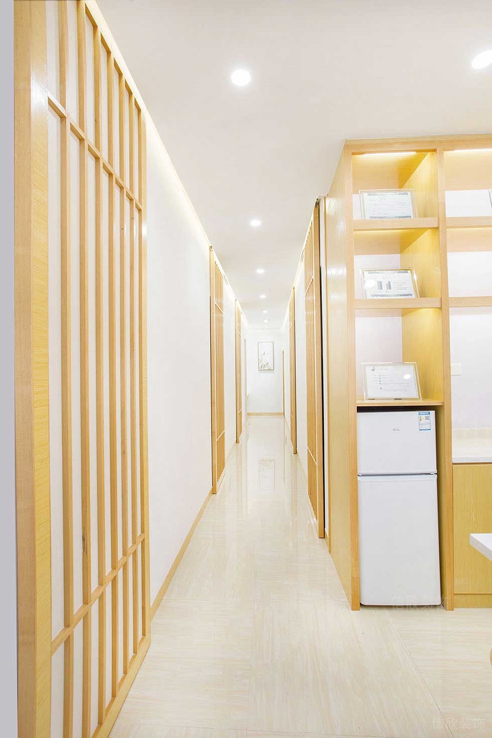 深圳寶安130平方美容院走廊裝修設(shè)計(jì) 純白色的走廊,很有創(chuàng)意的加上中式風(fēng)格的木藝屏風(fēng)隔斷,使其看上去對(duì)稱性強(qiáng),顏色對(duì)比更鮮艷,素雅的格調(diào),明亮的場(chǎng)景中,透出一股書卷氣和文化的內(nèi)涵。