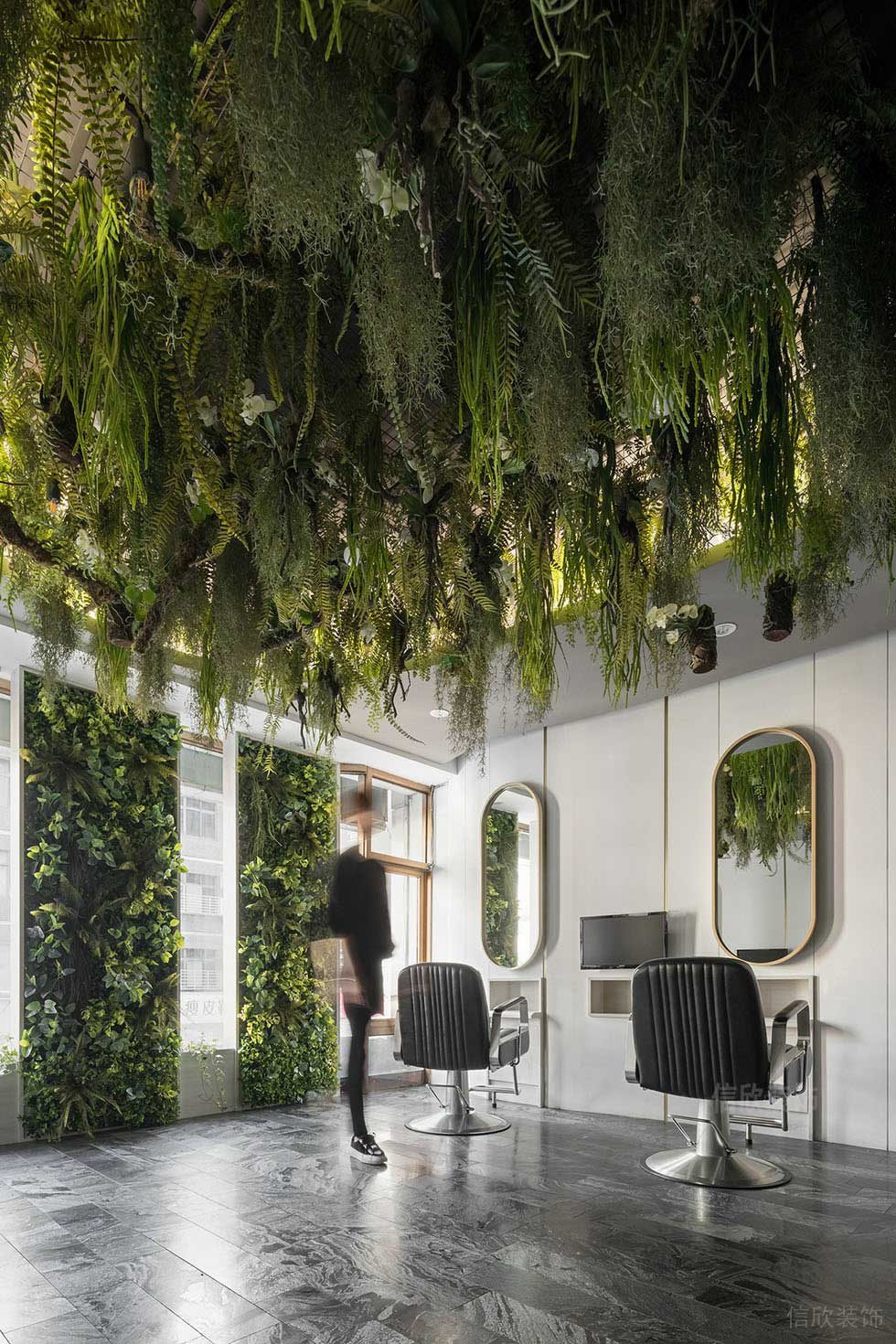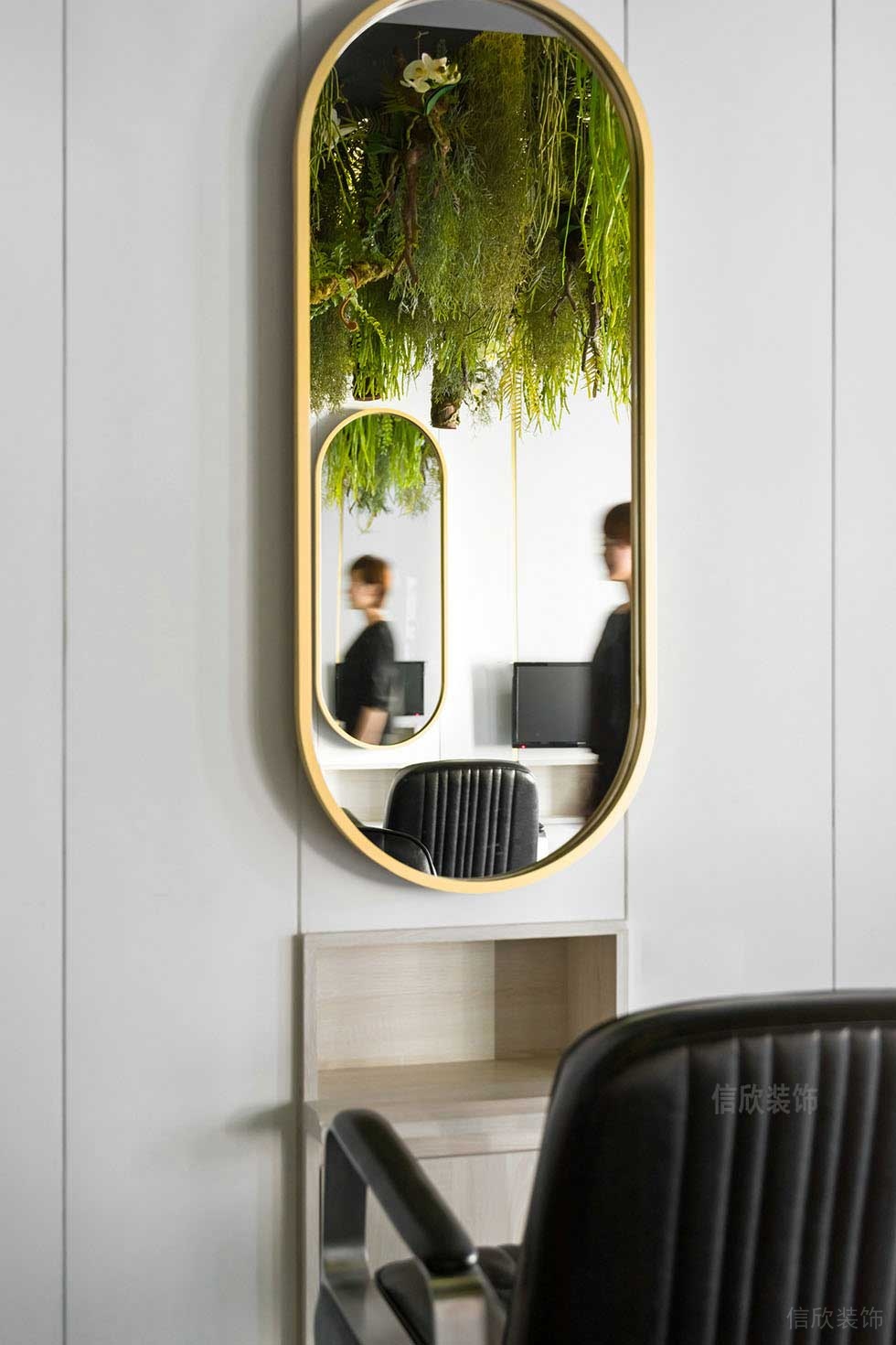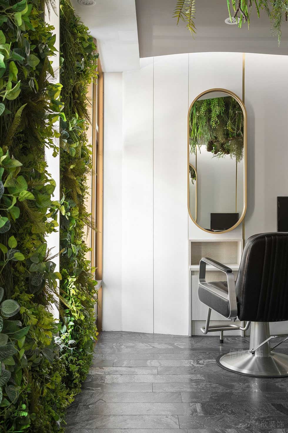 造型區(qū)的設(shè)計(jì),采用直通式 的處理手法,頂部是下垂的綠植,給人的感覺(jué)比較自然和清新,而在一個(gè)個(gè)金屬邊框小鏡面的反射下,空間的立體感又能得到很好的提升效果。