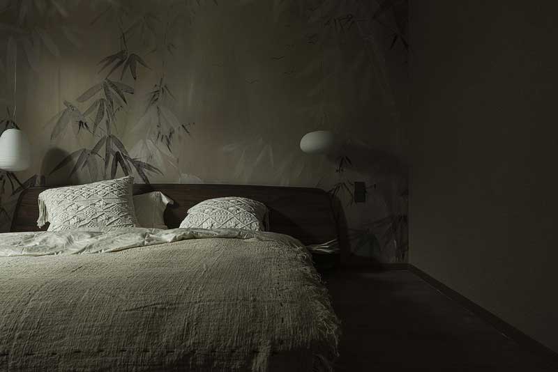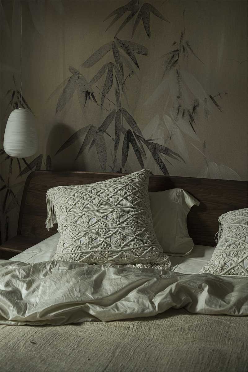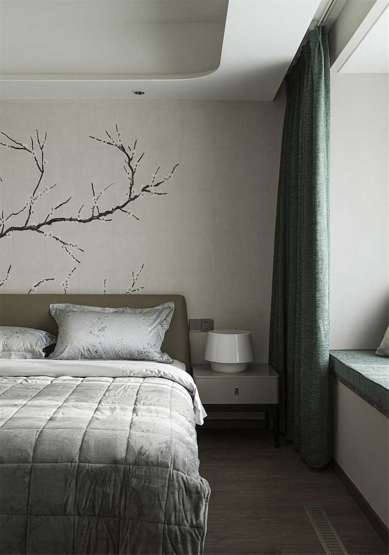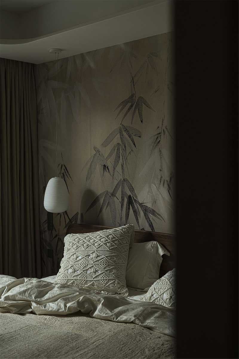 設計師將空間原有的造型墻和黃色墻紙予以拆除,換上了頗具清幽意蘊的墨竹墻紙,色調柔和,將空間打造得更為靜謐雅致。樸拙素雅的床品別具質感,讓人更加貼近自然的味道。