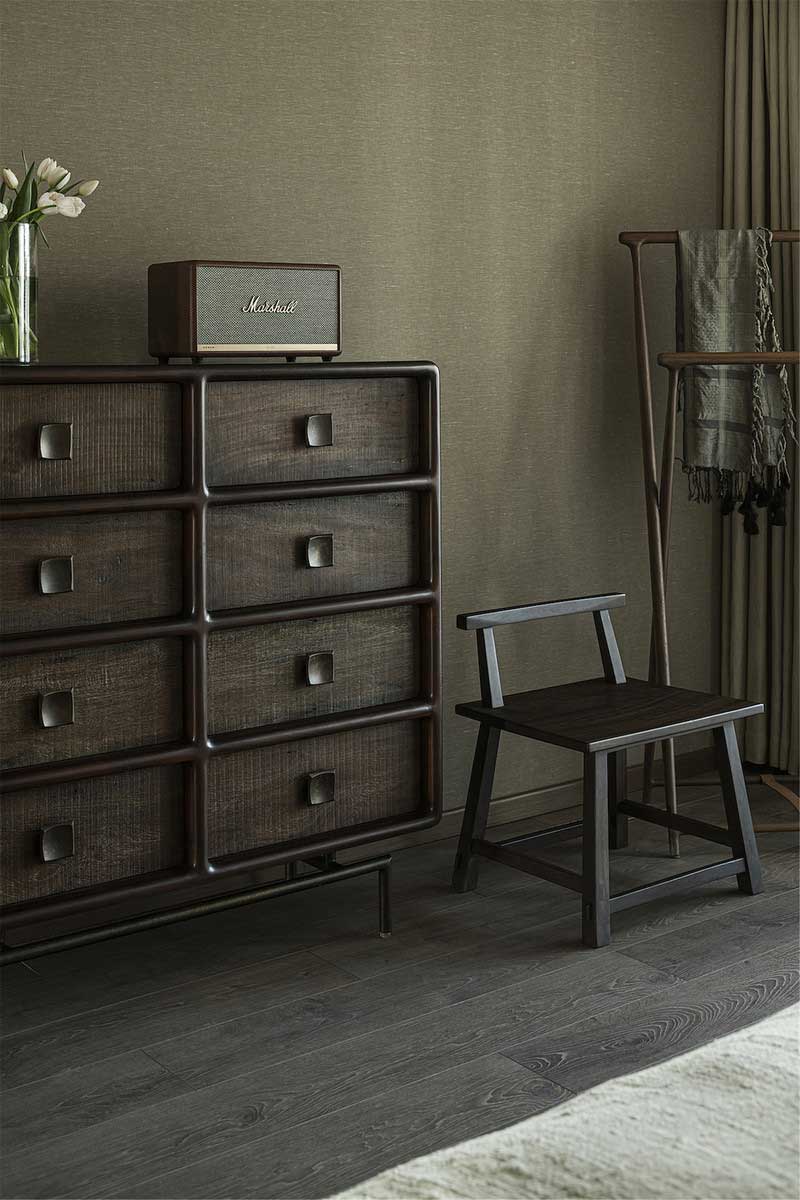 精美的木質斗柜與座椅、掛衣架,柔雅與硬朗并存,簡樸內斂,閃著溫潤的色澤,將空間的“木語”敘說到極致。