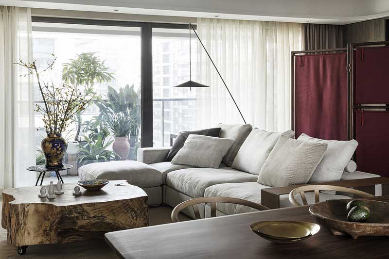 根雕的茶幾,古色古香的風貌。灰色布藝沙發,既百搭又能讓人更好的休息的放松,屏風式的隔斷,留出一小塊佛堂的空間,既做了空間的使用性分隔,也保證私密性。