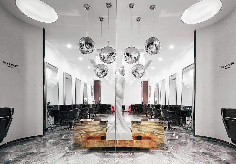 ▼理發區概覽,雕像裝置為美發空間注入靈動的藝術氣息
