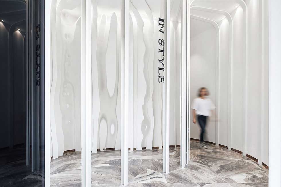 圓弧曲徑廊道是連接室內外的過渡地帶,也是提供給顧客留影的場景之一。凹凸不平的鏡面是設計師埋下的荒誕趣怪的種子,放大或縮小,妙趣橫生。條形界面刻畫出廊道的秩序感,將人的視覺層層推進,引領顧客抵達隱藏在入口背面的前臺位置。圓形元素進一步被運用,玫瑰金屬材質和地面的文化石賦予空間更鮮明的屬性:時髦而優雅。