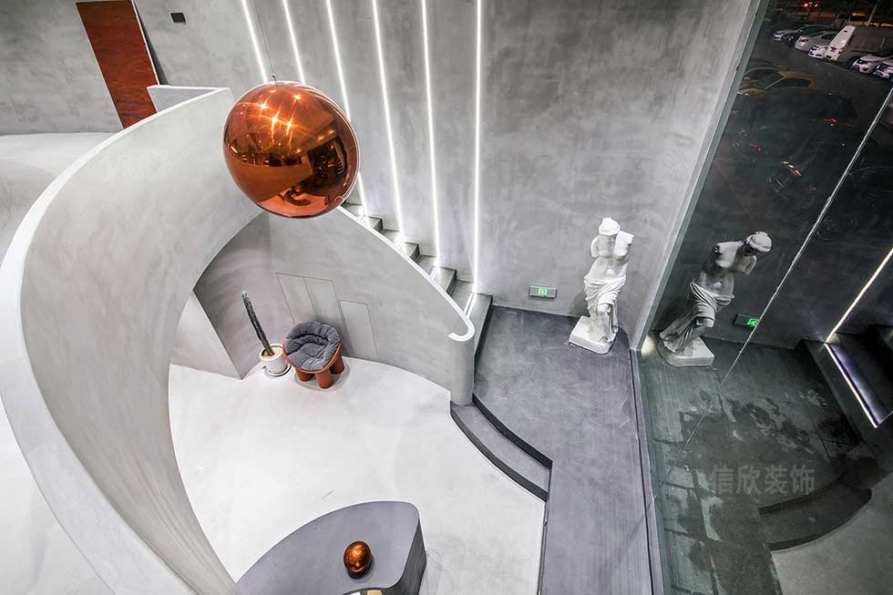 外立面的裝修設計理念,借鑒了極簡主義的設計風格,采用灰色為主題,通過顏色由深到淺的遞進方式,內部光影結構的變化,起到了一個逐層遞進的效果。