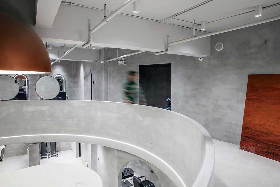 圓柱形的中空結構,環形曲線分布的美發區,通過淺色系冷色調的完美著色,使整體看起來連貫性和統一性很強,又透露著復古和完美主義的理念,工業化社會生活的精致和美感。