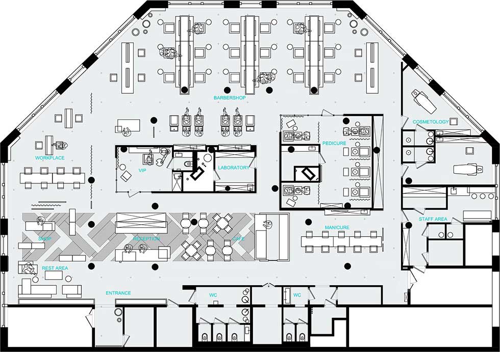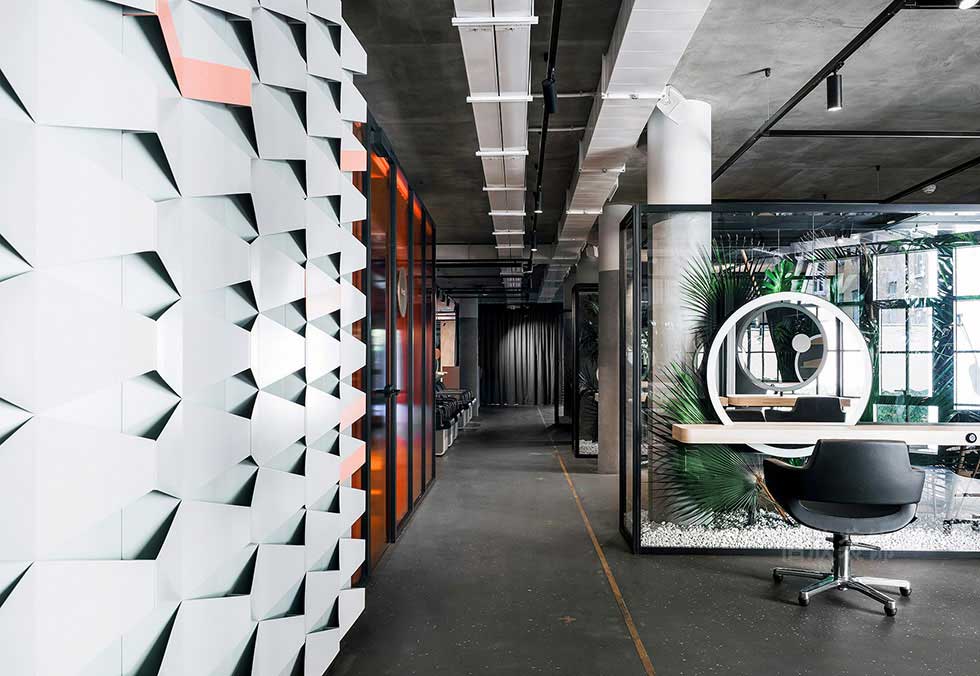 設計理念:GLAMY Beauty Spot是一家集多種功能于一身的頂級美容沙龍,主要理念是讓不同類型的形象設計師可以在這里協(xié)同工作,如:發(fā)型師、美容師和美甲師。空間還具備其它功能如舉辦工作坊和培訓課程、從品牌網(wǎng)上商店訂購產(chǎn)品和一處健康食品咖啡廳。這家沙龍占據(jù)了圣彼得堡市中心一座新建建筑一整層的空間。建筑事務所面臨的挑戰(zhàn)是將沙龍的不同功能結合起來,劃分不同的區(qū)域同時保持空間完整性和輕盈感。