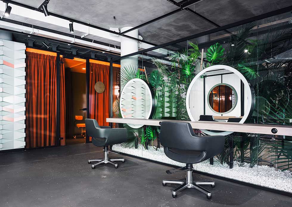 為了實現(xiàn)這一效果,所有的主要設備功能空間和美容室成為一個組團,布置在空間右側并通過一道隔斷與其它房間分隔開。開放的中心空間是兩個獨立單元,包括足部護理室和美容室,這樣可以將大廳分隔開但又避免造成空間瑣碎。建筑師采用種滿熱帶植物的玻璃溫室分隔發(fā)型空間。兩個中央單元采用統(tǒng)一的強調性裝飾——v型墻面金屬板和有色玻璃。