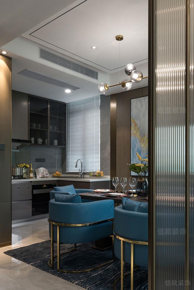 深圳市南山區星都·梅沙天邸餐廳 開放式廚房的設計,符合現代開闊大氣的理念,同時空間顯得寬敞而不局限,深色的餐桌,線條優美的藍色餐椅,讓整個餐廳立馬變的活潑起來,并且帶有歐式貴族范的優雅品質。