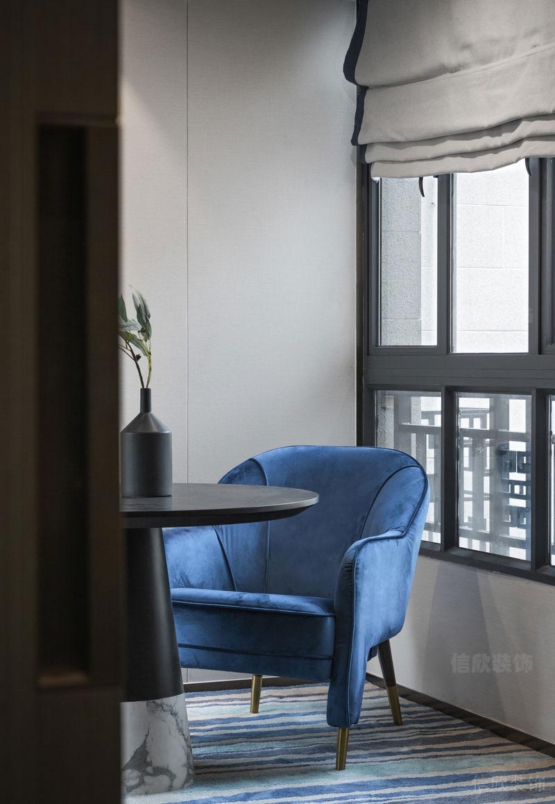 深圳市南山區星都·梅沙天邸休閑區 黑白的茶幾,貴族的湛藍的軟硬,抽象畫的線條結構,在視覺上舍棄張揚,通過對線條與色塊的巧妙應用,營造出輕松的空間氛圍,傳遞“輕奢華、新時尚”的生活理念。