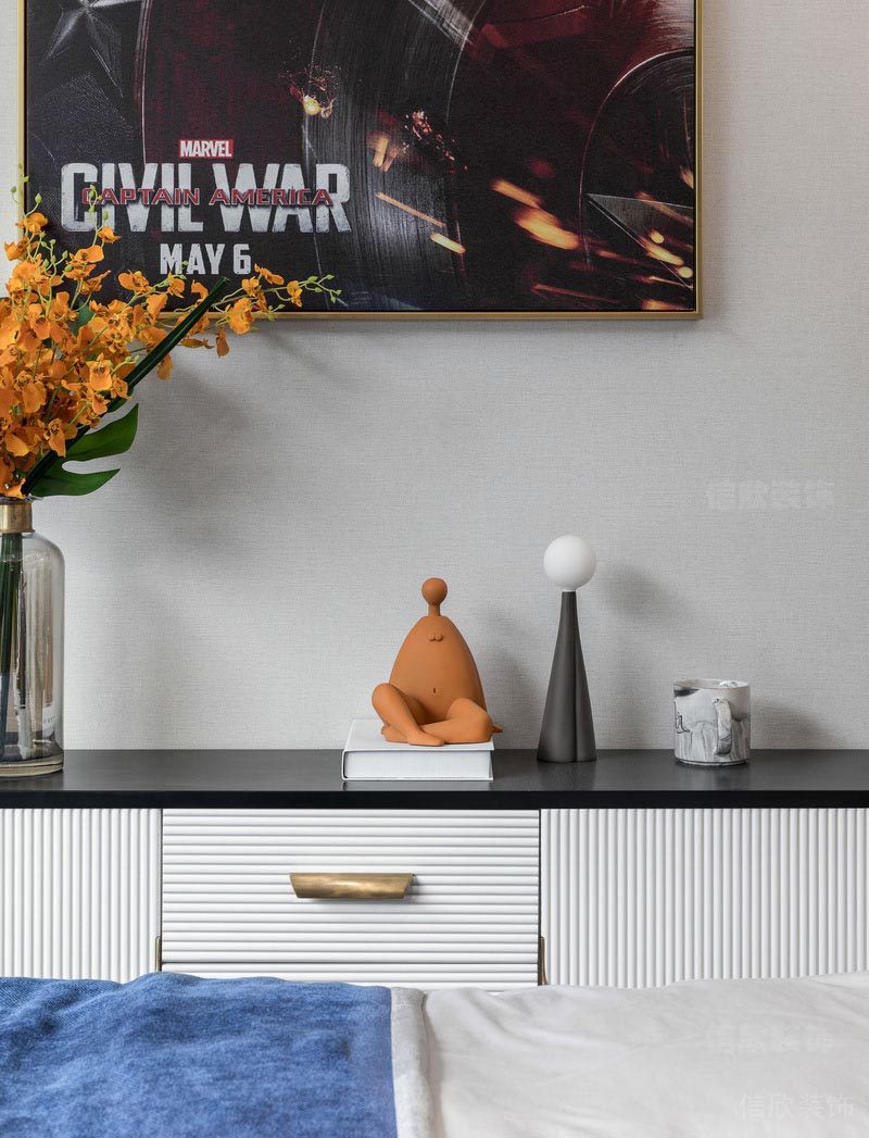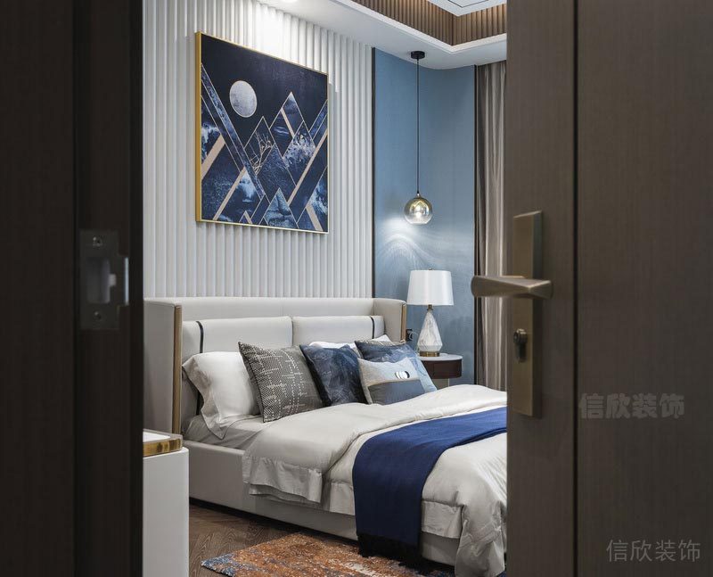 深圳市南山區星都·梅沙天邸主臥 線條簡潔的白色,如天空般閃耀的淺藍,在抽象畫的潮流元素,古典的布藝床,優雅的床頭柜的搭配下,讓整間臥室看起來,色彩秀美,五彩繽紛;舉手投足之間,無比閃現出對品質生活的無限向往。