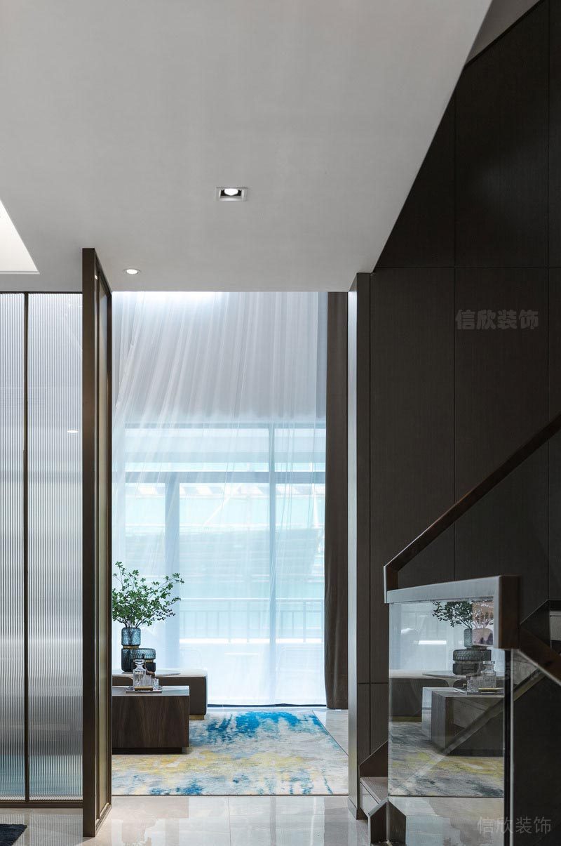 深圳市南山區星都·梅沙天邸樓梯 黑色玻璃的現代色彩,深咖色木飾面板的深沉簡單,在金屬吊頂的裝點下,立馬變的流光溢彩貴氣十足。
