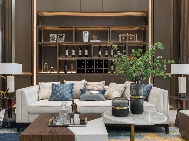 深圳市南山區星都·梅沙天邸沙發背景墻 酒柜代替電視背景墻,沙發不靠墻的設計方式,增加了空間感和實用性,深咖實木的深沉,金屬線條的時尚,讓整個客廳的格調立馬得到提升,用優美的裝飾,裝點出奢華的效果。