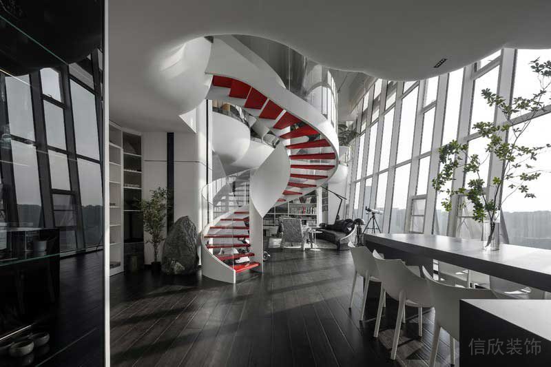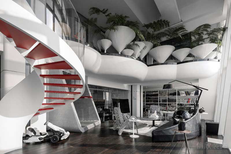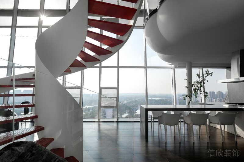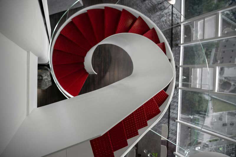 辦公室的旋轉式的鐵藝樓梯,簡潔時尚,又不會顯得過于占空間,鐵藝玻璃的扶手,紅色的樓梯面,把本來具有工業(yè)風的旋轉樓梯,變的靈動活躍,熱情似火,充滿了童話般的色彩。