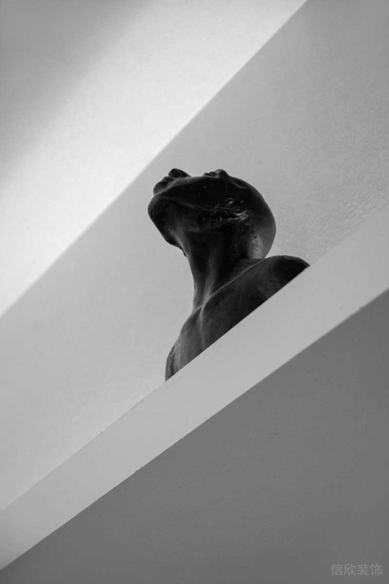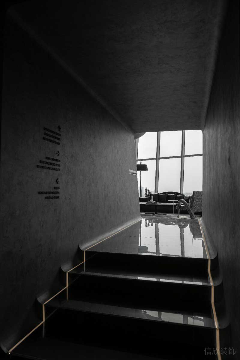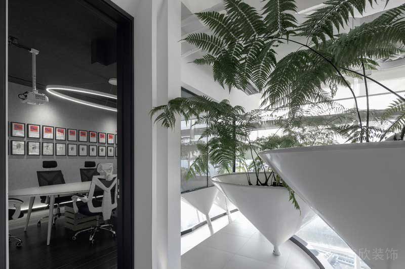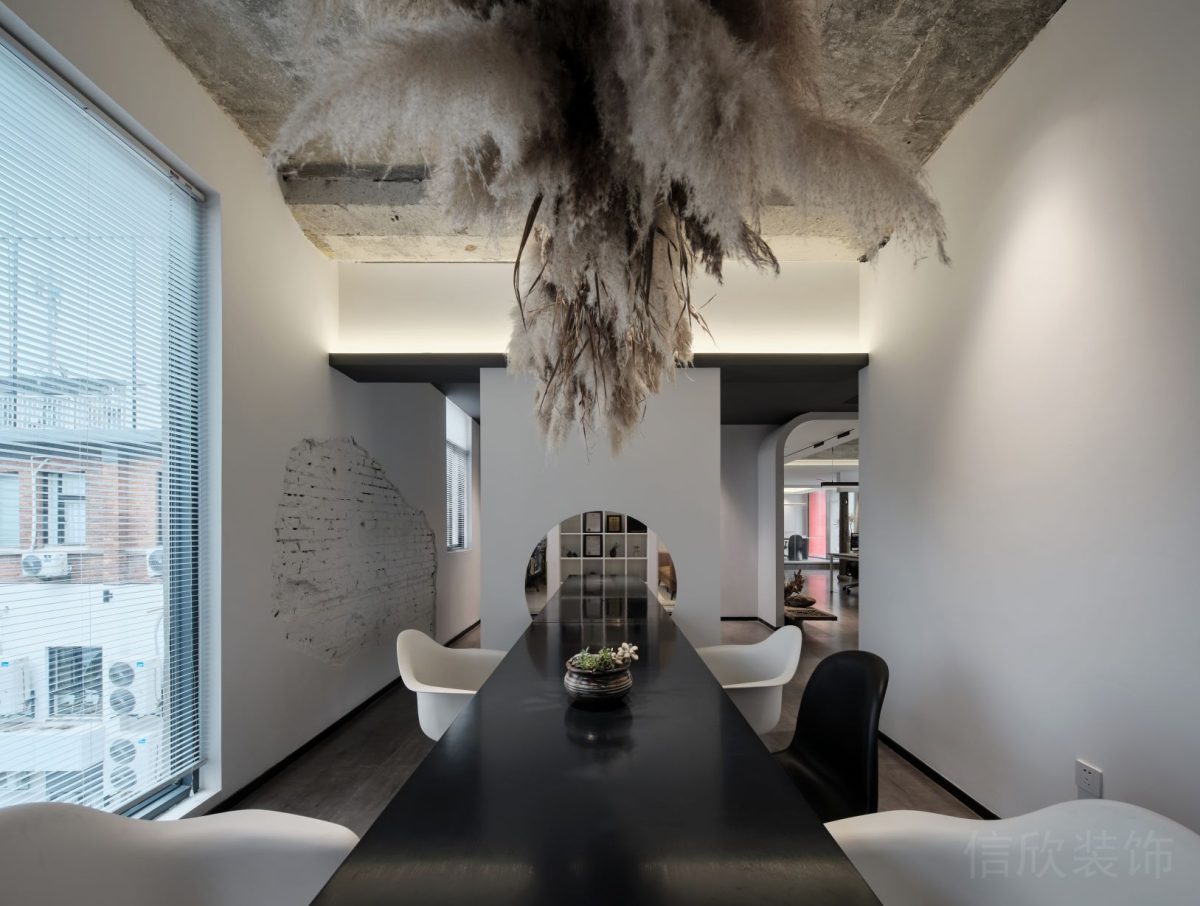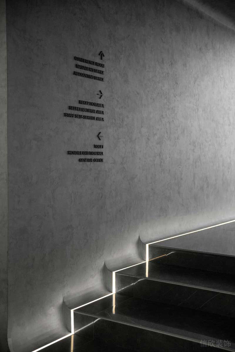 黑白會的辦公室設計,采取色彩過渡的方式,黑色的頂面原結構設計,在光影下灰白色的墻,再到黑色實木紋理地板,色彩間逐次遞進的搭配方式,在光影的折射下,展現(xiàn)出冷色調的冷酷,干練,直接的高級感。