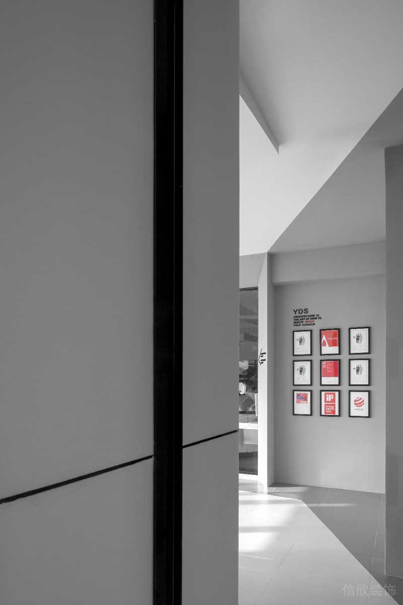 辦公室入戶的裝修設計,采用了黑色天然大理石,像墨玉一樣反光度極高,景象倒映在地面上,如湖水般清澈秀美,立體式的黑色紋理石材,光影下讓客戶一眼就可以看到公司獲得的獎杯和獲獎證書。