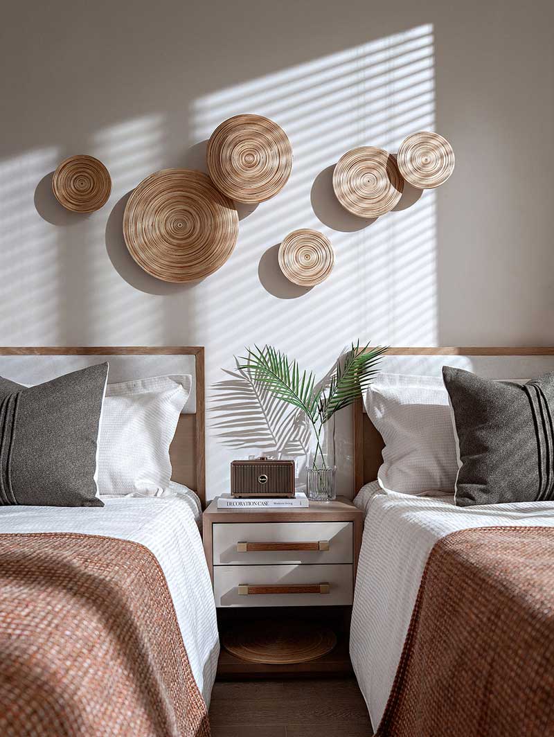 深圳南山區別墅裝修設計-次臥空間次臥空間簡凈純粹,刪繁就簡,自然克制的極簡白+層次有序的原木墻飾設計,為房間注入靜謐、舒適、自在的空間格調。