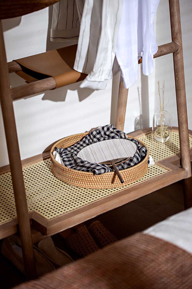 深圳南山區別墅裝修設計-樓梯負一層是家庭社交娛樂空間的延續,包括會客廳、茶室、理療房。會客廳,可以滿足訪客接待需求。悠然愜意的海灘壁紙、淡雅清新的原木格柵,搭配形制獨特的實木藤編椅、水墨肌理質感的藝術地毯,構成了會客廳至靜雅大氣的非凡格調。