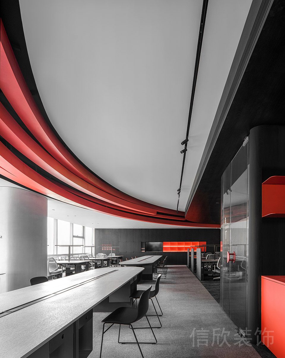 弧形墻面搭配燈光結(jié)合大屏幕與墻面繪畫體現(xiàn)了科技與人文的氣息。
