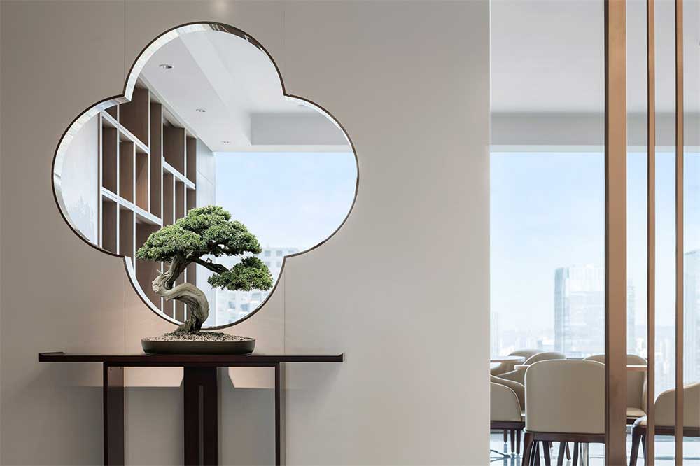 深圳市寶安1000平國中創投辦公室裝修會議室,中式月門的設計,兩邊做天然大理石瓷器展臺,更有古典文化底蘊。