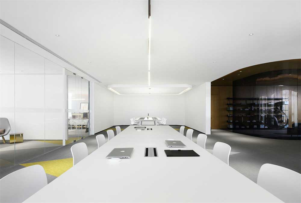 現代風格辦公室開放式會議室,設置在走道盡頭的開放式灰色,素雅時尚的白色會議桌椅,開闊的空間,更利于思考和交流。