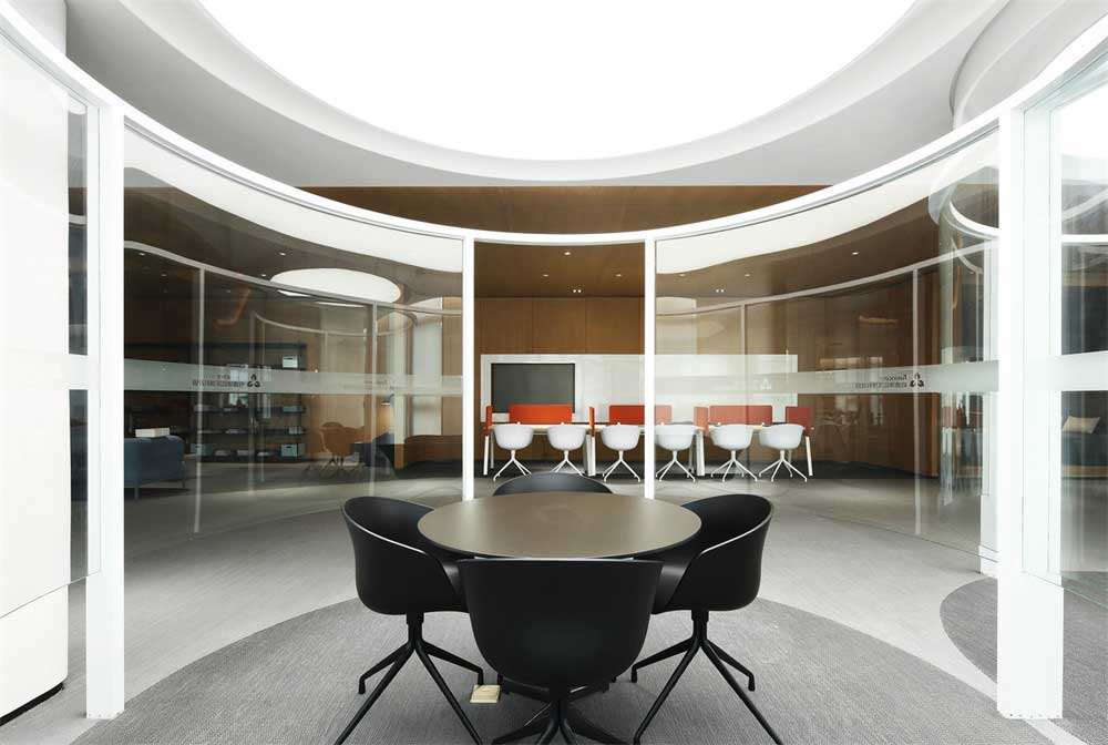 圓形玻璃的小會議室,黑色如郁金香般的四人小會議桌,兼具使用性和觀賞性。