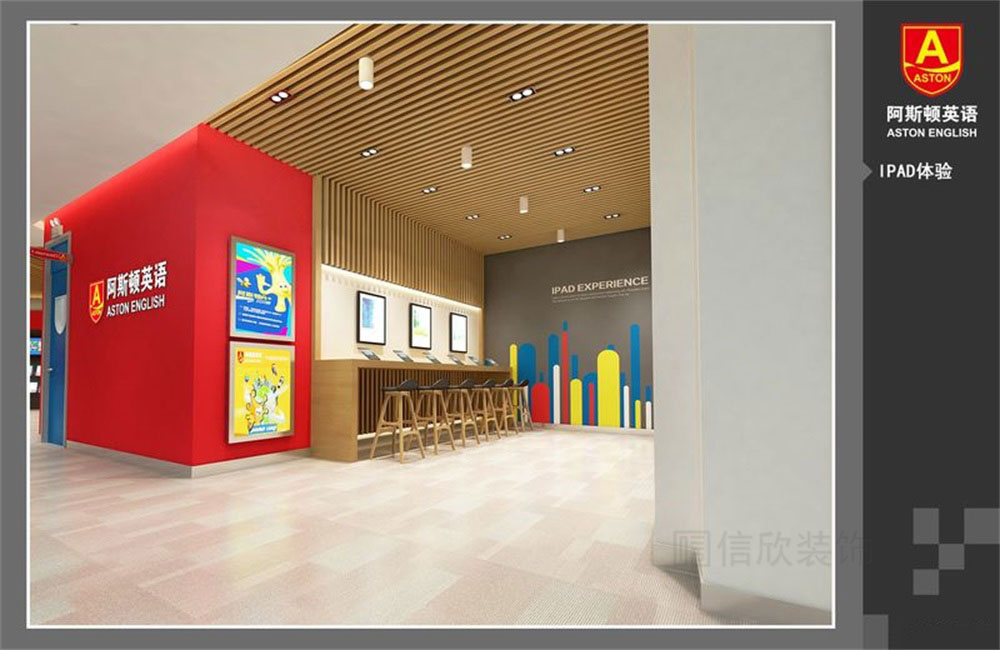 木藝格柵頂給人的感覺,有家的溫馨,錯拼的地面,增加立體感,大紅色純色背景墻的應用符合學校的主題,也多一分大氣醒目的品牌效應。
