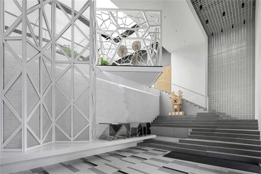 入口為網(wǎng)狀金屬結(jié)構(gòu),并利用高度優(yōu)勢,營造出令人震撼的視覺效果。網(wǎng)狀的連接象征著蒲公英的傳播與秩序。金屬logo和木質(zhì)的吉祥物,作為有趣和跳躍的代表,點(diǎn)綴其間。