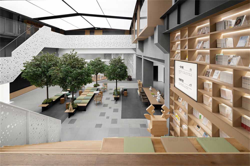 會客區(qū)的周圍有書吧、階梯教室和共享廚房三個功能區(qū)域,同“會客公園”的概念相輔相成。