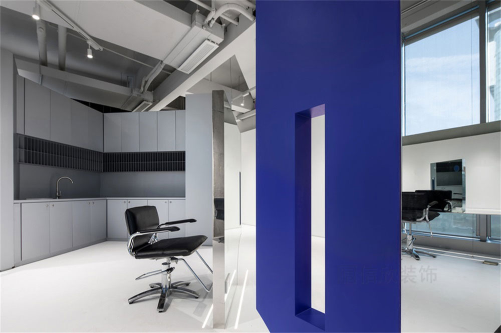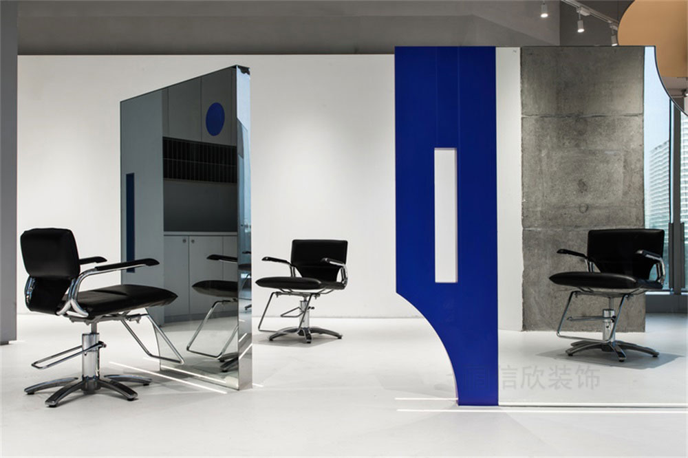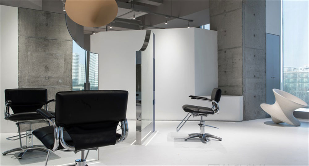 剪發(fā)區(qū)在白色地面,灰色頂面的應(yīng)用看上去素雅簡約,雙面式立體圖形的全身鏡,猶如一個(gè)個(gè)美麗的藝術(shù)品,填補(bǔ)了整個(gè)場景的空缺,有點(diǎn)睛之筆的妙處。