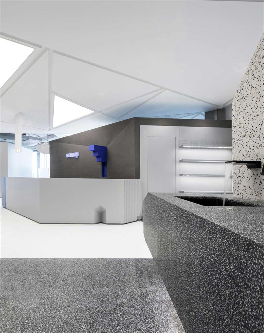 水吧設(shè)置在一個(gè)三角形區(qū)域,懸空式的設(shè)計(jì),符合后現(xiàn)代風(fēng)的天馬行空,不拘一格的思維,在灰色人造石元素的包裹俠,顯得特立獨(dú)行,獨(dú)特美妙。